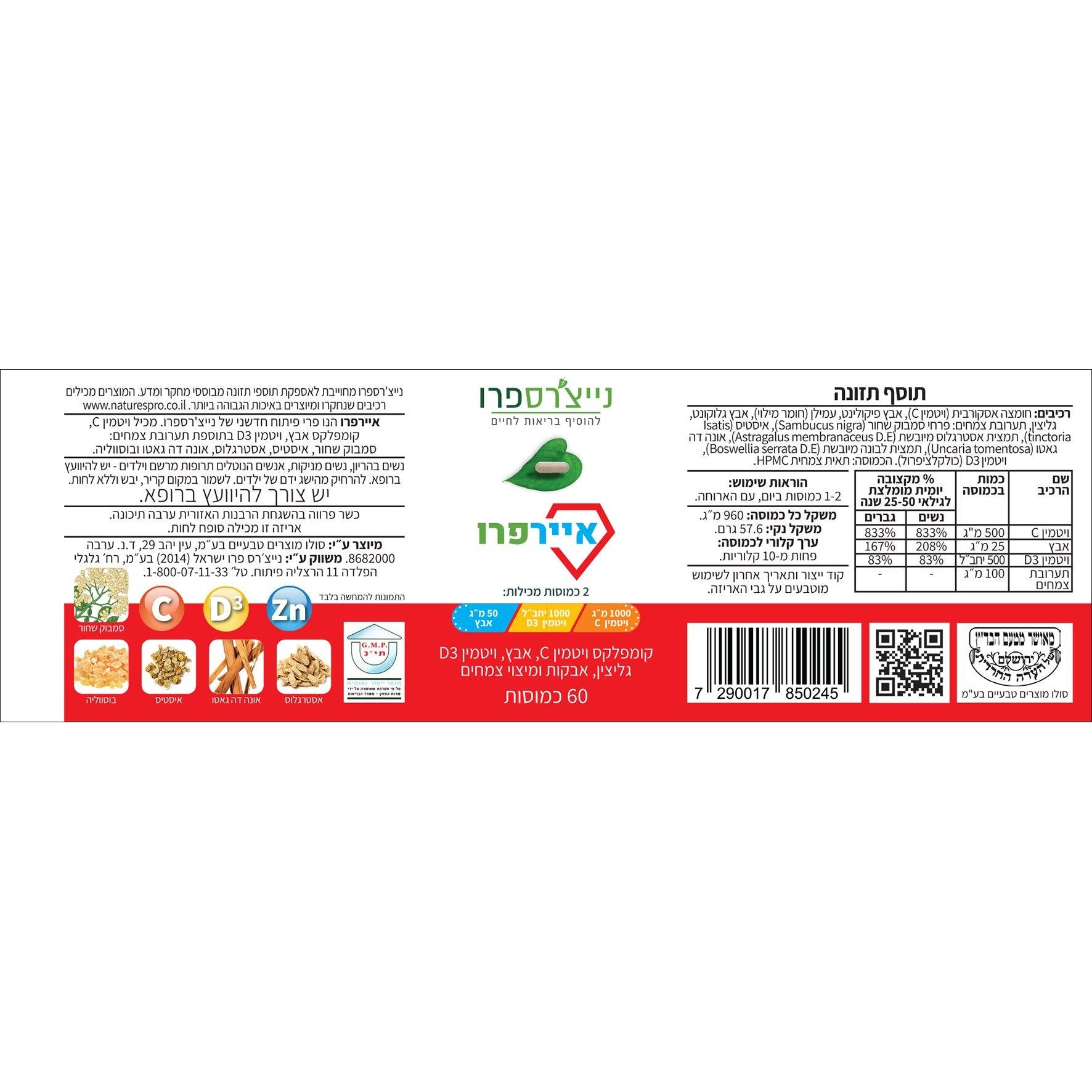 איירפרו הנו פרי פיתוח חדשני של נייצ'רספרו. מכיל ויטמין C, קומפלקס אבץ, ויטמין D3 בתוספת תערובת צמחים: סמבוק שחור, איסטיס, אסטרגלוס, אונה דה גאטו ובוסווליה.