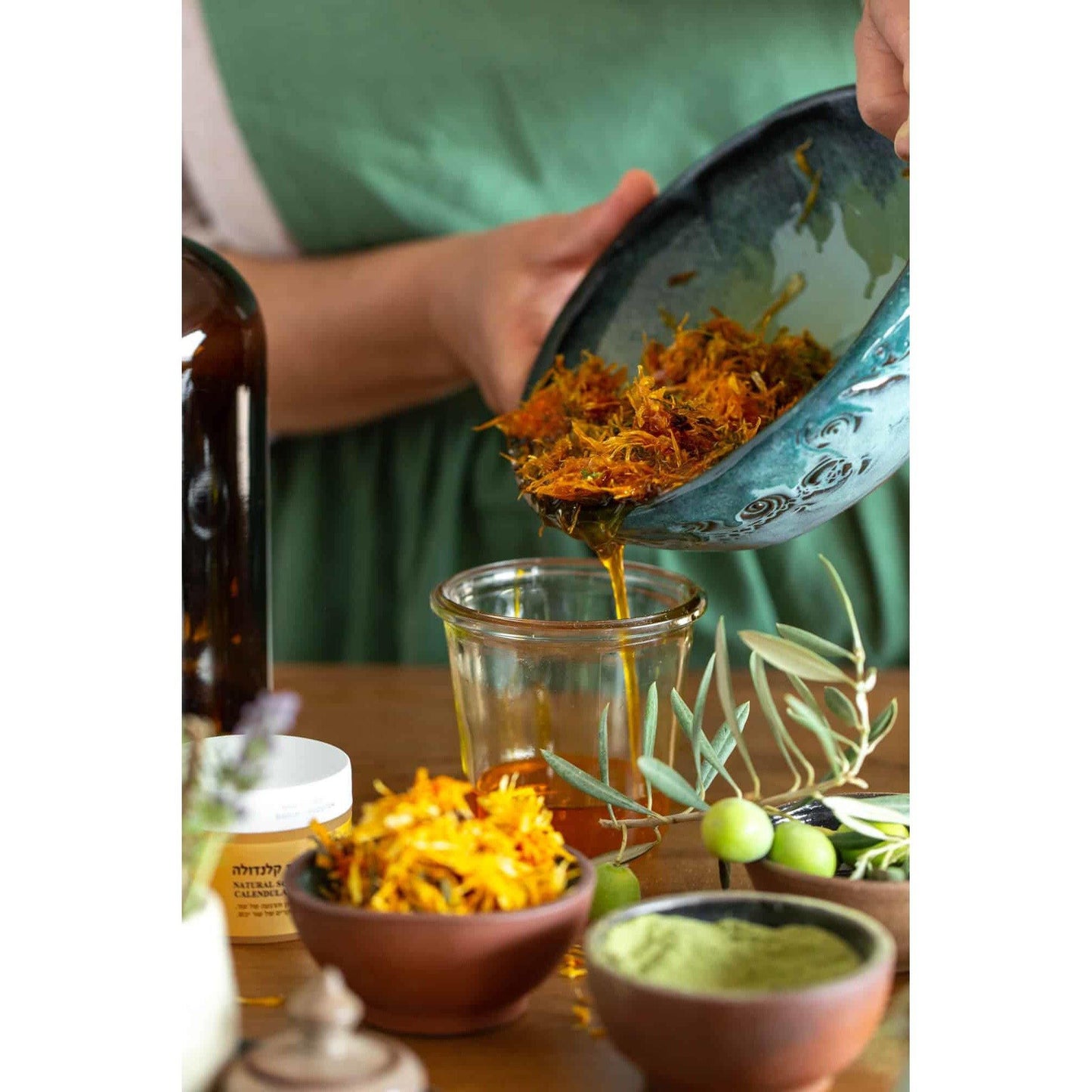 משחת הקלנדולה שלנו מלאה בכמויות בכלל לא מאופקות של שמן קלנדולה איכותי ומדהים, שאנחנו מייצרים בעבודת יד ממש אצלנו בטכניקה סודית - ושעושה את כל הקסם. פרחי הקלנדולה המופלאים אורגניים, וגדלים בציפורי בחוות על-עלים, והם באיכות פשוט נדירה. אין עליהם!